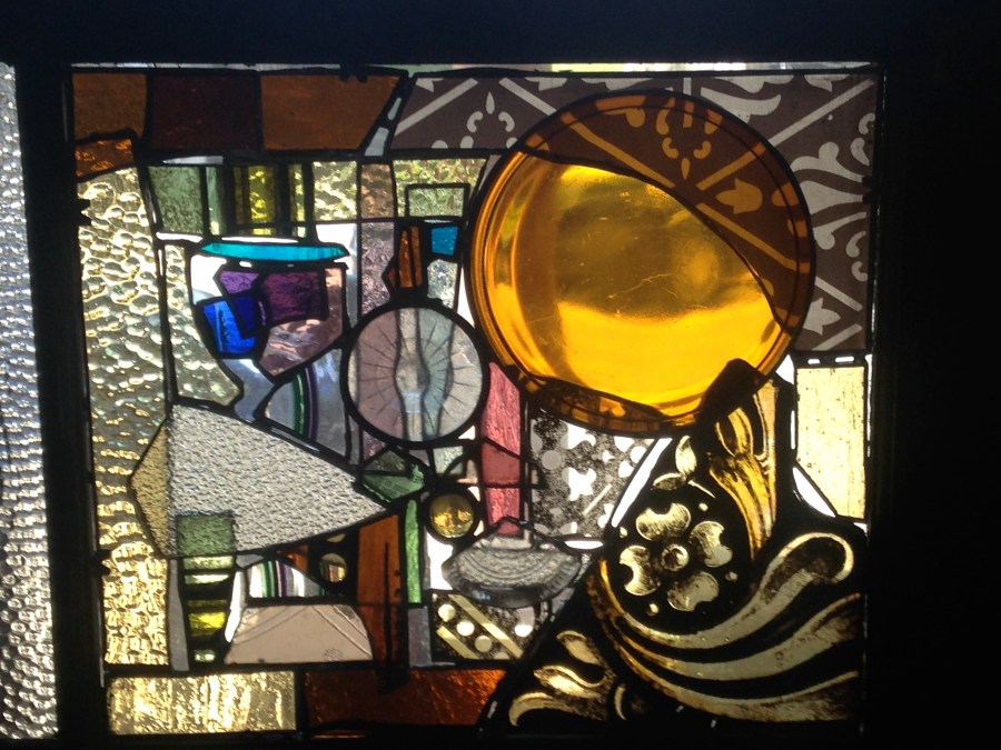 A detail of the piece, mostly antique painted glass.