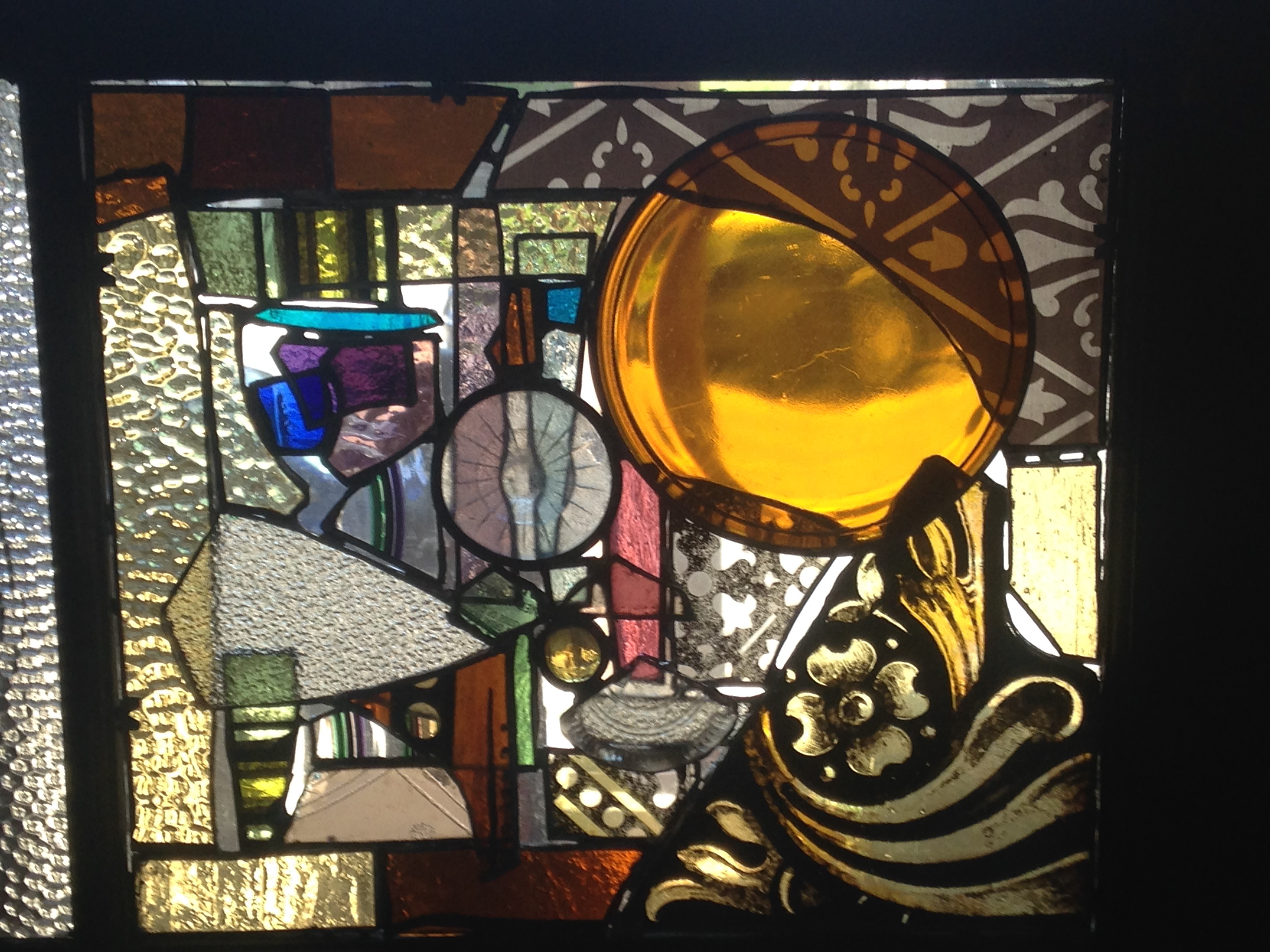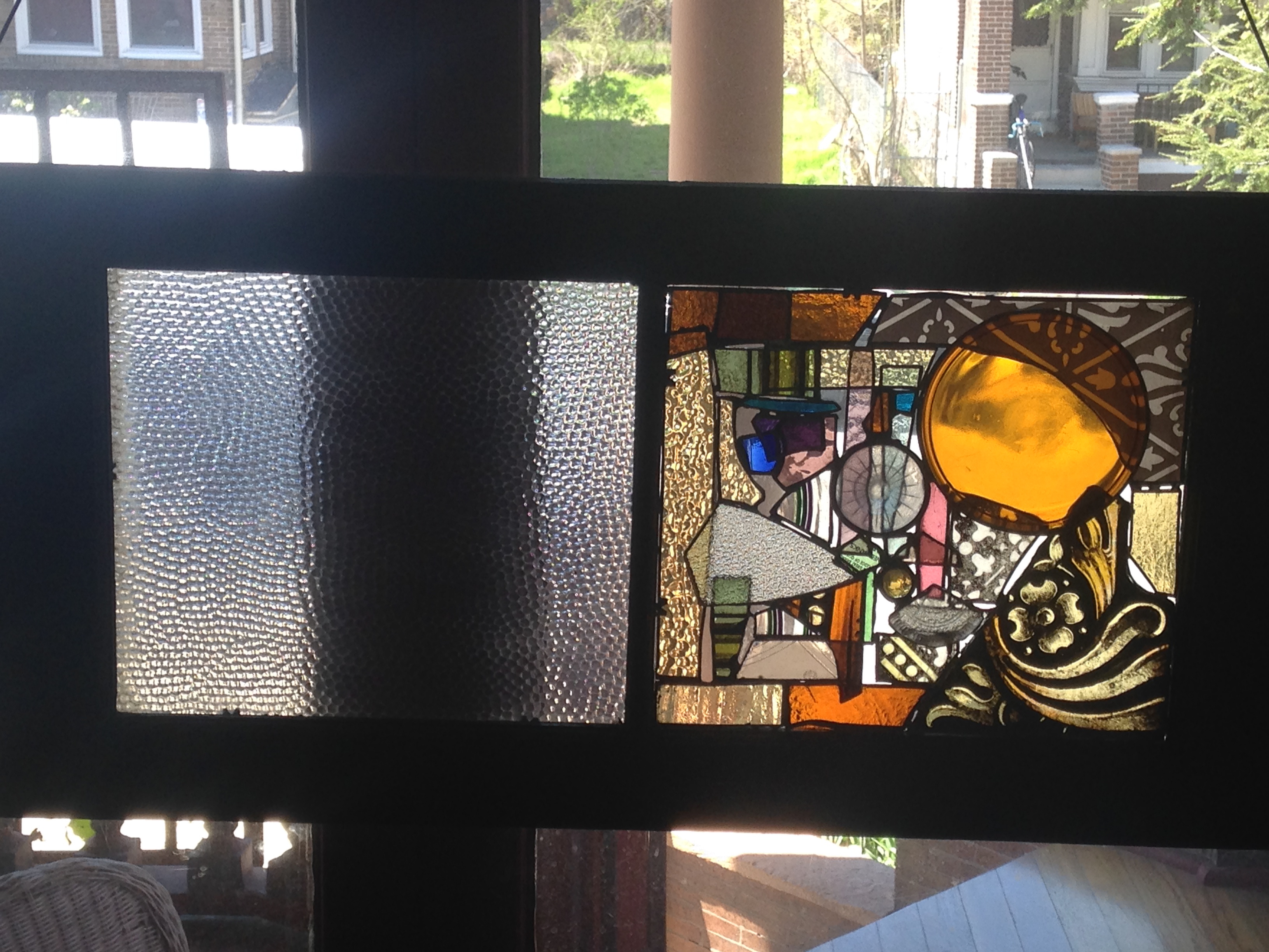This is some of the Oxford glass from the Franklintown sale: mostly early 20th century, with some newer glass tossed in. It is in a two light (basement) window frame which was left on a west Philly street, found, and scrubbed clean. A 1910 window frame is a perfect home for this lovely 1910 glass.